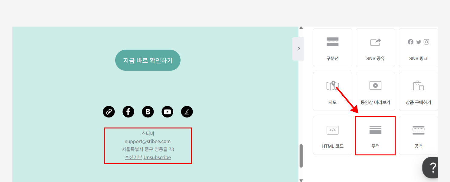 1. 화면오른쪽 편집 상자 목록에서 \[푸터] 상자를 추가합니다.