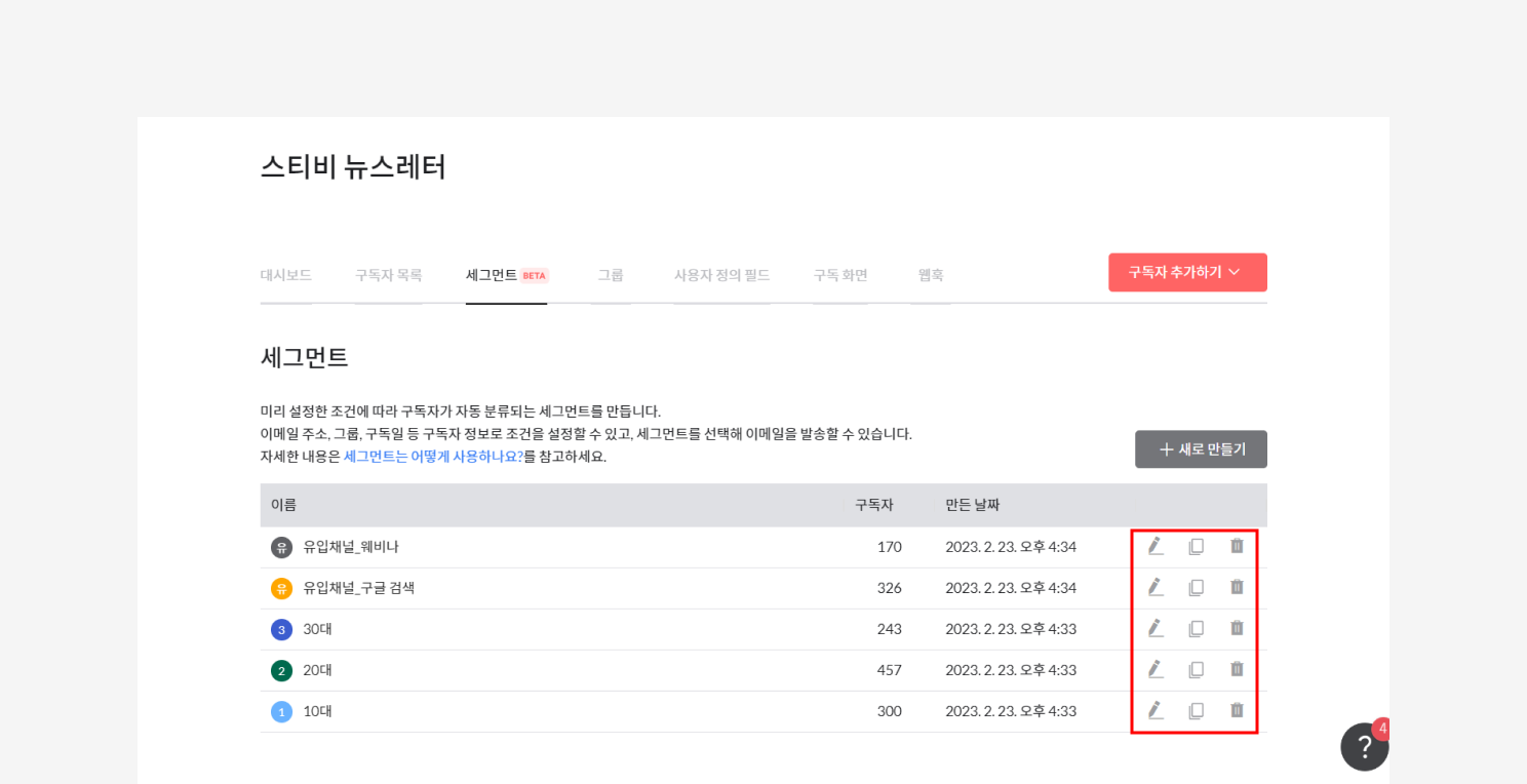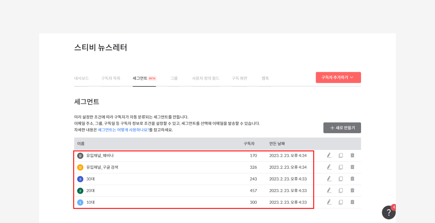 생성한 세그먼트의 이름, 구독자 정보, 만든 날짜가 표시됩니다. 세그먼트 이름을 클릭하면 각 세그먼트의 설정에 따라 분류된 구독자 명단을 확인할 수 있습니다. *세그먼트 구분색은 자동으로 설정되며, 색상을 수정하는 것은 불가능합니다.*