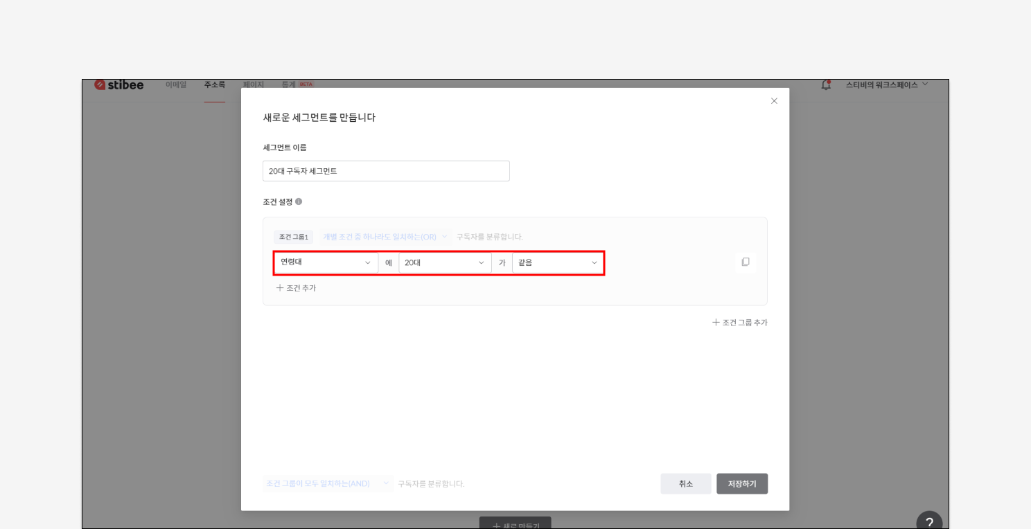 세그먼트를 이용할 경우, 원하는 조건만 설정하면 각 조건에 맞는 구독자가 자동으로 분류됩니다. \[[그룹](https://help.stibee.com/list/classify-subscribers/how-to-use-groups)] 기능과 달리 분류되는 구독자가 설정한 조건에 따라 동적으로 할당되는 특성을 가집니다.