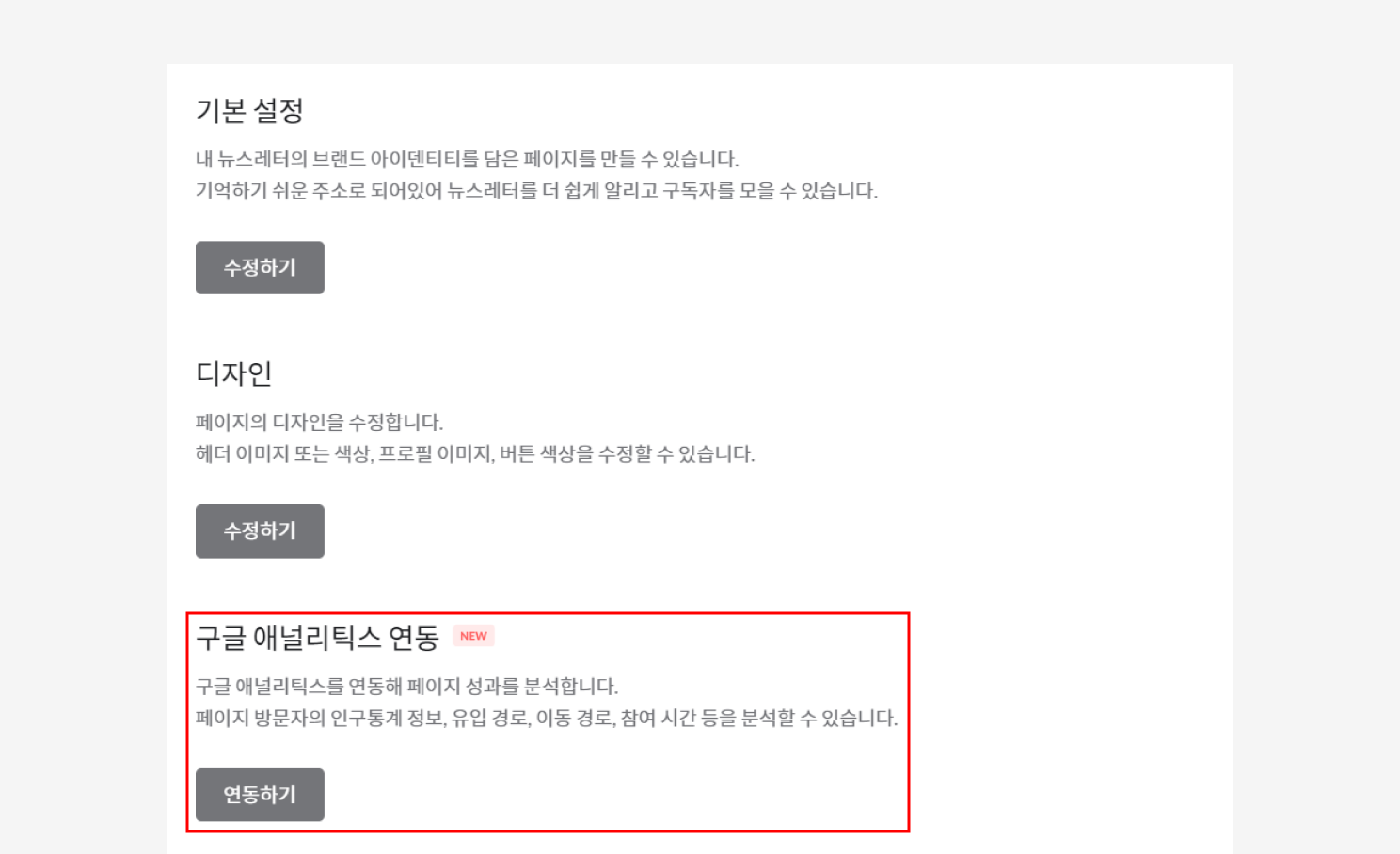 페이지와 연동할 구글 애널리틱스 측정 ID를 입력하면 페이지 성과를 분석할 수 있습니다. '측정 ID'는 구글 애널리틱스에서 확인할 수 있습니다. 자세한 방법은 [여기](https://support.google.com/analytics/answer/12270356?hl=ko\&sjid=1015199864081941492-AP)를 참고해 주세요.