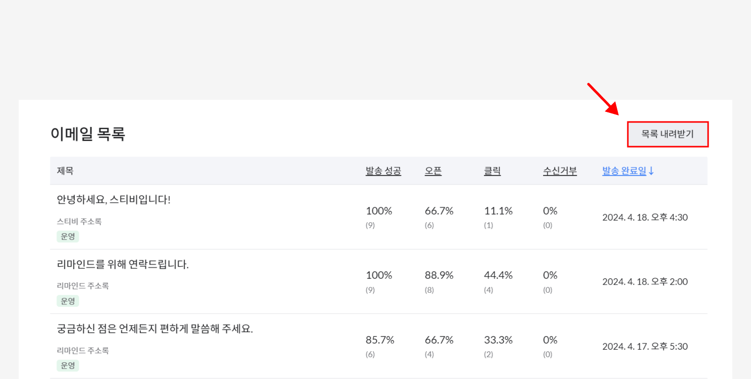 <figure><img src="https://468498824-files.gitbook.io/~/files/v0/b/gitbook-x-prod.appspot.com/o/spaces%2FeAMHRdY4ATDXfWZWQs3p%2Fuploads%2F8zWjO1YNzaz9779OplW6%2F%EC%9D%B4%EB%A9%94%EC%9D%BC%20%EB%AA%A9%EB%A1%9D%20%ED%86%B5%EA%B3%84%20%EB%82%B4%EB%A0%A4%EB%B0%9B%EA%B8%B0.png?alt=media&#x26;token=8f58773b-cf1a-4870-8015-07b67ef1c2d3" alt=""><figcaption></figcaption></figure>
